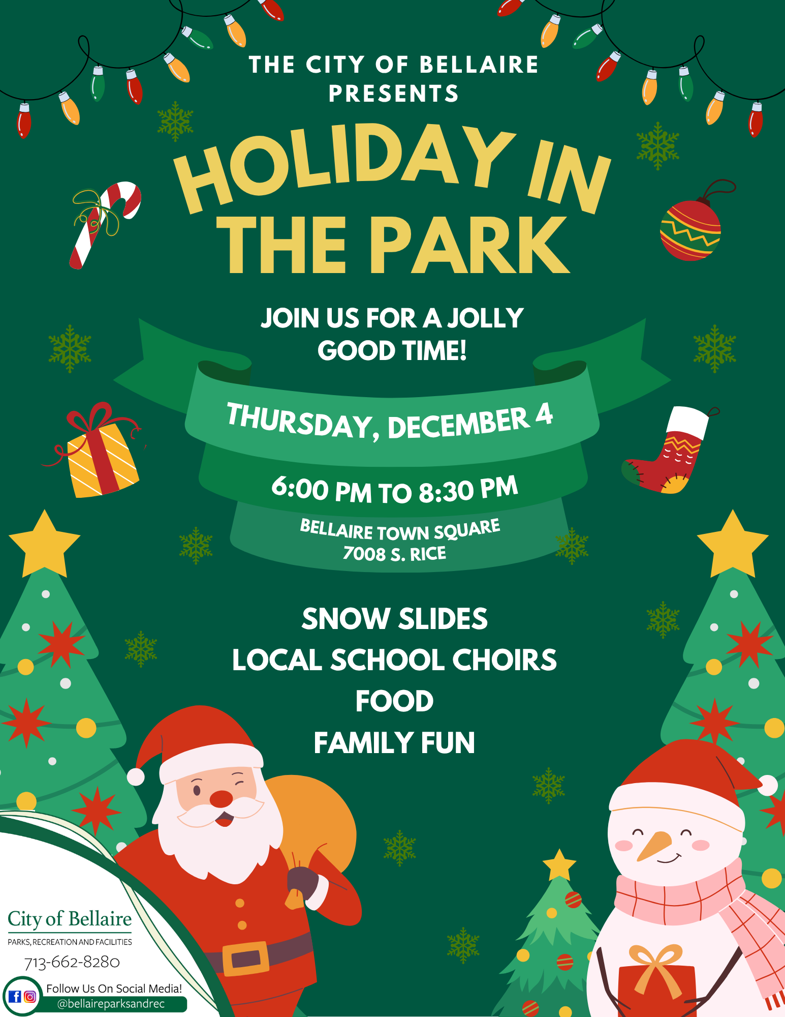 Applications are open! If you are interested in sponsoring Holiday in the Park or being a vendor at the event please email jdokell@bellairetx.gov.