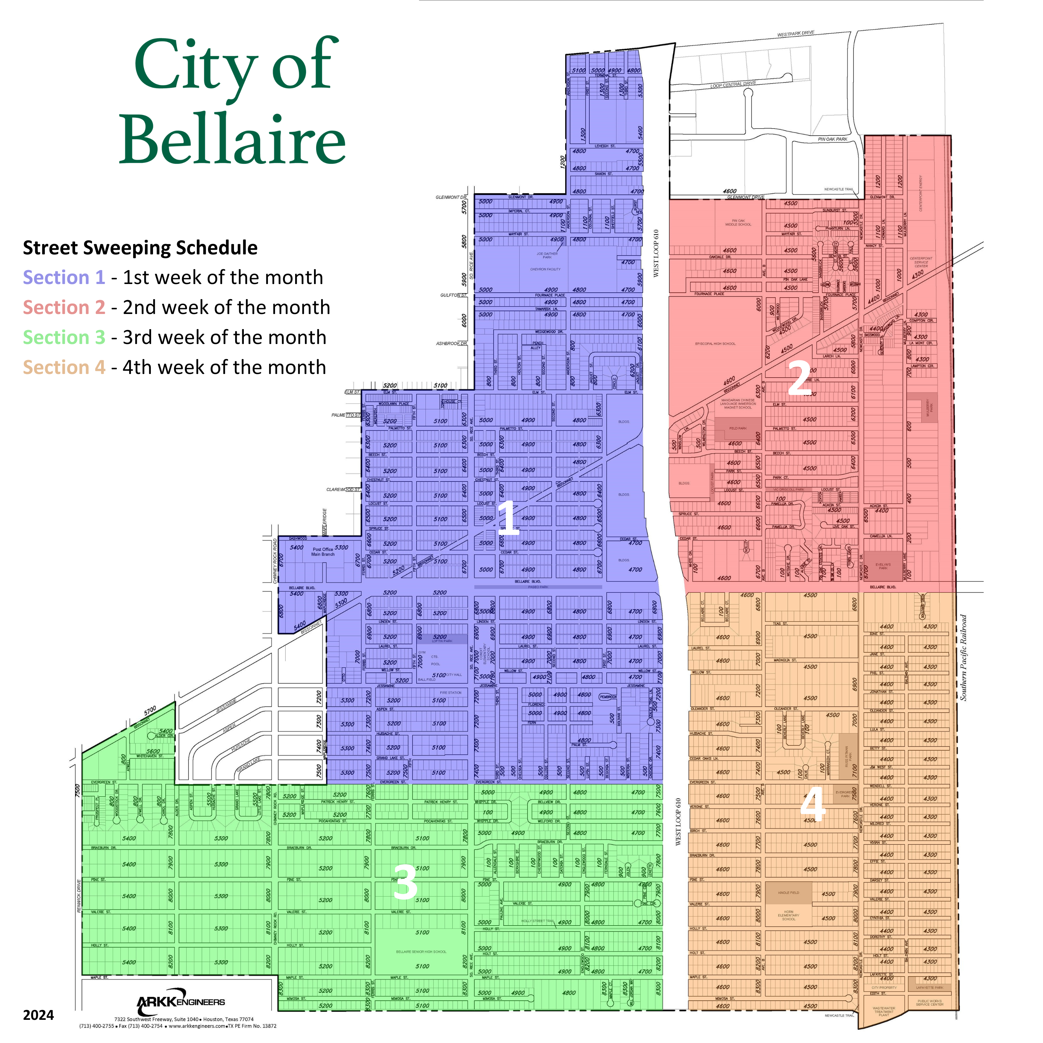 The city is divided into four sections for street sweeping. Street Sweeping Section Map